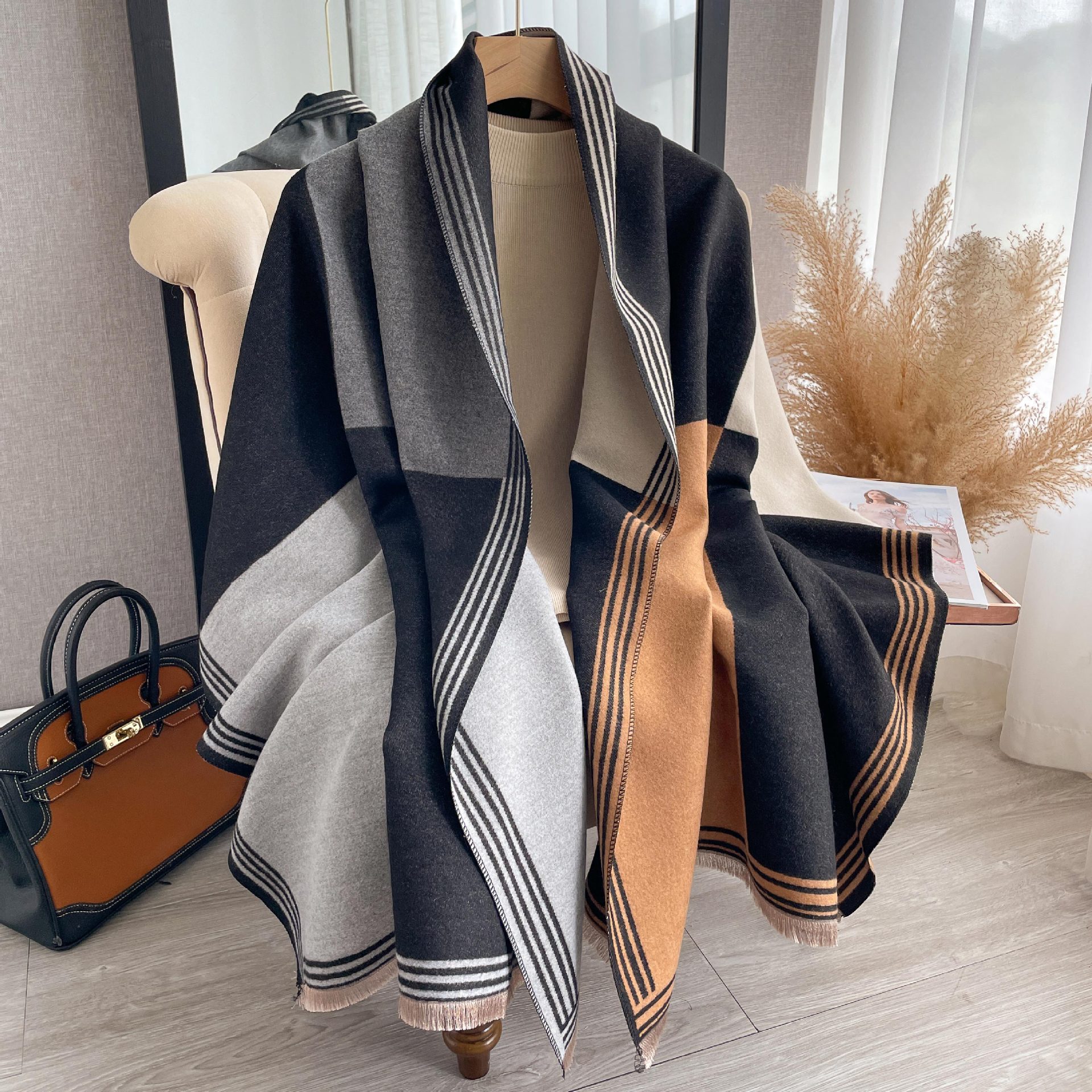 Korean-style Color-Block Fashion Faux Cashmere Scarf Womens Dual-Use Air-Conditioning Shawl